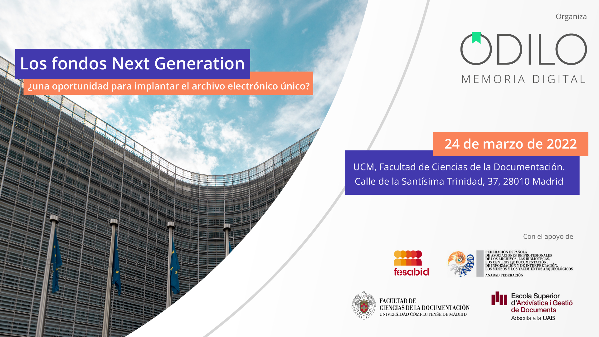 ODILO y la Facultad de Ciencias de la Documentación, UCM; FESABID; ESAGED y ANABAD organizan: Los fondos Next Generation ¿una oportunidad para implantar el archivo electrónico único?»